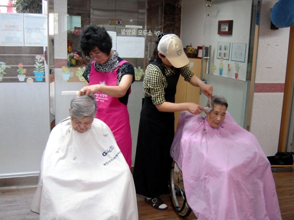이 즐거운 봄 손님과 함께 이미용자원봉사자들이 방문하여 어르신들의 머리손질을 해주셨네요.