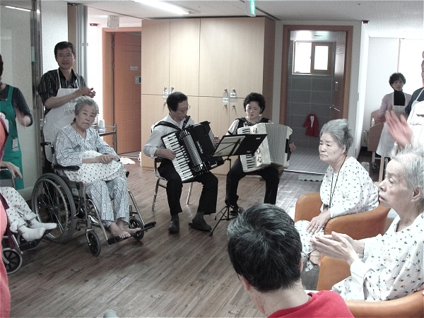 아코디언 연주에 맞춰 노래를 부르시는 어르신들